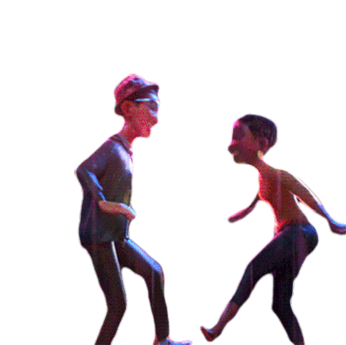 Dot and Eva from Disney's 'Us Again' joyfully dancing and grooving together, holding hands and jumping with happiness.