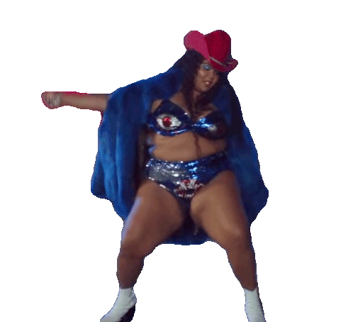 Lizzo energetically dances in a sparkly blue bikini, flowing blue cape, and a vibrant red cowboy hat.