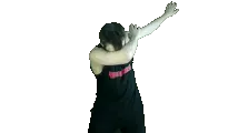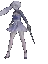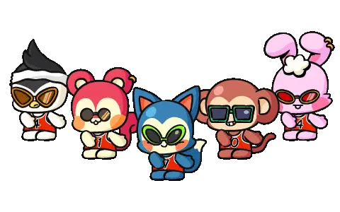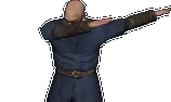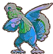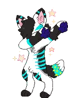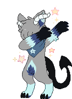 An animated pixel art sticker of a gray furry character with horns and a tail, performing a dab dance move with sparkling stars.