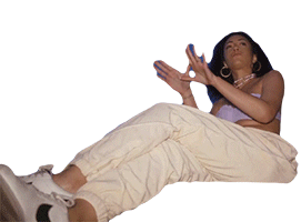 Jenevieve is seen dancing and bopping with energy, moving her hands and body while sitting on the ground.