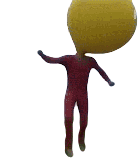 A playful figure in a red suit with a large yellow balloon head dances energetically, performing a shuffle-like movement.