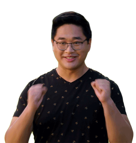 Stephen, wearing glasses and a black shirt, performs an excited happy dance with fist pumps.