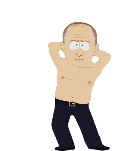 Vladimir Putin, depicted in the iconic South Park style, performs a shirtless dance with hands behind his head.