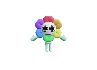 Dandy from Dandys World, a colorful flower-like character with a white head, sways playfully.