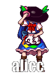 Alice Margatroid from Touhou Project in pixel art, holding a pink object and then covering her face. A cute animated sticker.