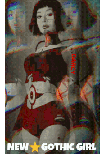 Abstract and distorted visual of Darcy Gibby, featuring vibrant colors and a pixelated, blurred effect.