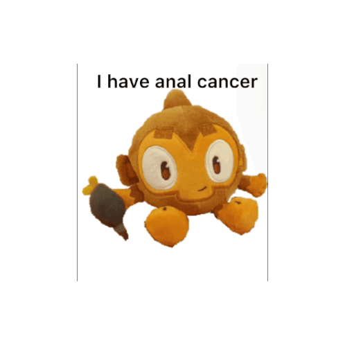 A flat graphic of a Dart Monkey from BTD6 is displayed, featuring the controversial text 'I HAVE ANAL CANCER' on its body.