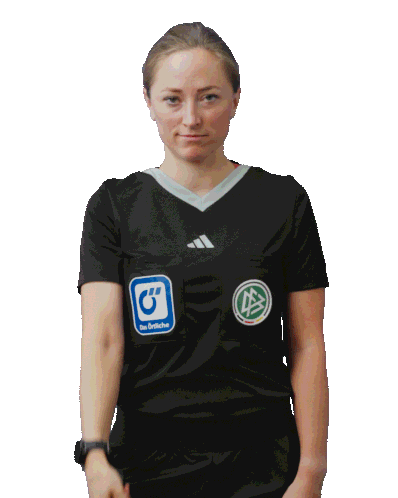 Melissa Joos, a football assistant referee, holds up her flag in a black uniform, representing the DFB and Das örtliche.