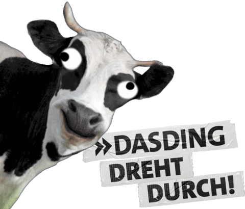 A funny animated sticker featuring a wide-eyed cow and the German text 'Dasding Dreht Durch!', meaning 'Dasding is going crazy!'.