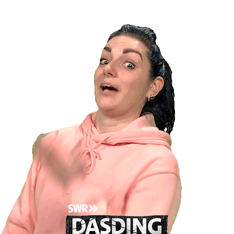 Sabrina Dd from Dasding reacts with a shocked expression, hand over mouth, wearing a pink hoodie.