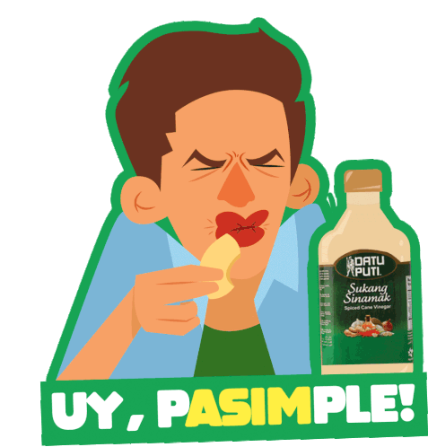 An animated man makes a comically sour face after tasting something, with a bottle of Datu Puti Sukang Sinamak vinegar nearby.