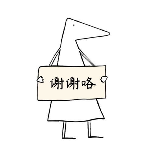 A simple, cute character holding a sign that says "Thank you!" in Chinese, surrounded by small hearts.
