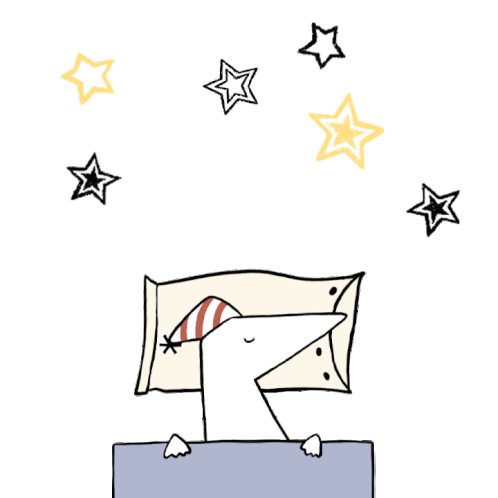 A cute, long-nosed creature wearing a sleep cap, tucked in bed with Zzzs and stars, wishing good night.