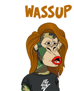 A "Desperate Ape Wife" NFT character with camouflage skin and long hair says "WASSUP" in this animated sticker.