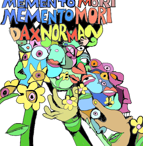 An abstract, colorful animation by Dax Norman featuring surreal faces, hands, and flowers, with "Memento Mori" text, evoking visionary art.