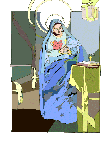 Daxnorman's stylized Madonna with a flaming Sacred Heart, surrounded by doves and religious symbols.