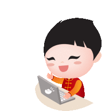 A cute cartoon boy in traditional Chinese attire gives a thumbs-up while using a laptop, celebrating Chinese New Year.