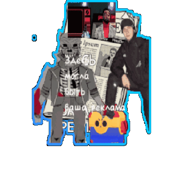 A pixel art sticker featuring Dclxviclan, a skeleton, and a man on a Brawl Stars box with a Russian advertisement.