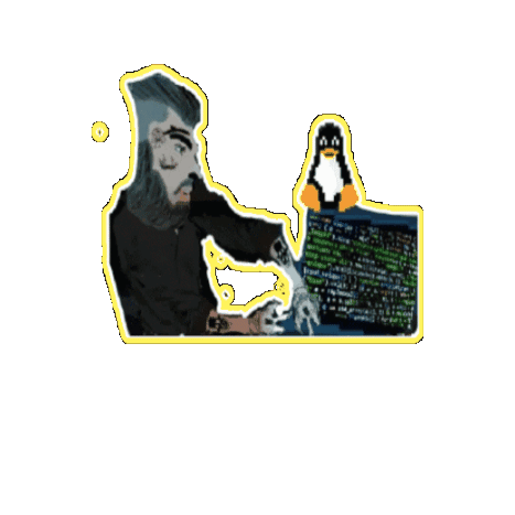 Dclxviclan, a bearded man with tattoos, codes on a computer alongside a pixelated Linux penguin mascot, surrounded by green code.
