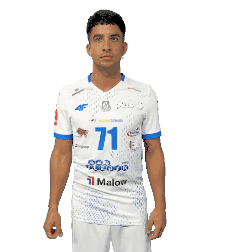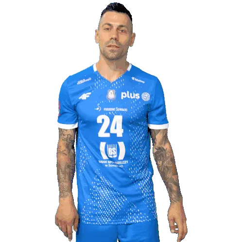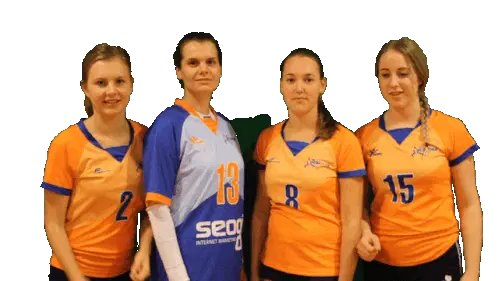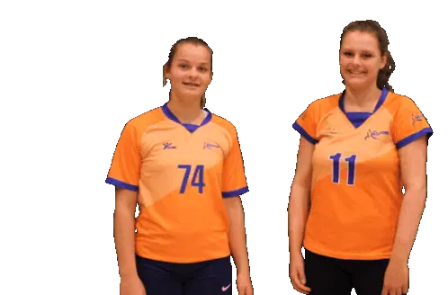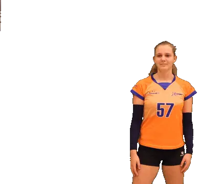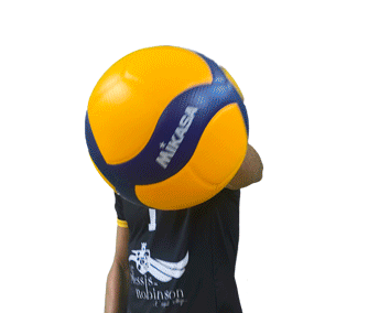 Volleyball player De Leon in action, hitting a ball, pointing, and smiling. An energetic sticker for sports fans.