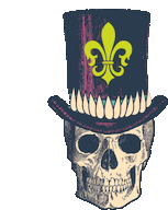 A stylized skull wearing a top hat adorned with a fleur-de-lis, representing New Orleans culture.
