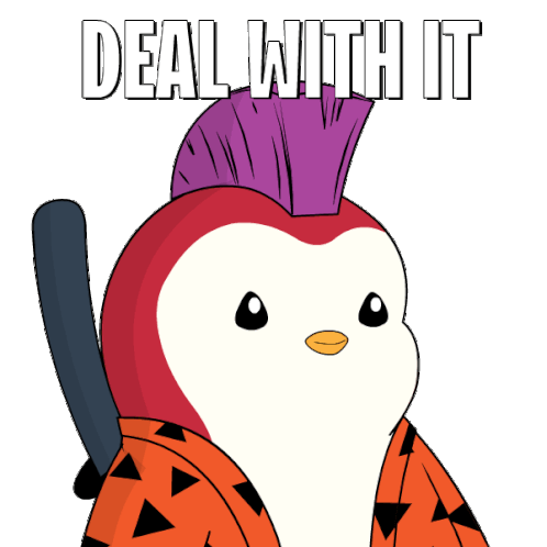 A cool penguin with a purple mohawk and blue sunglasses says 'Deal With It', exuding confidence and swag.