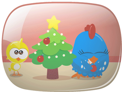 Galinha Pintadinha and a little chick joyfully decorate a festive Christmas tree with ornaments and a star.