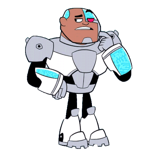 Cyborg de Los Jóvenes Titanes en Acción en pose pensativa, contemplando una decisión con una expresión seria.