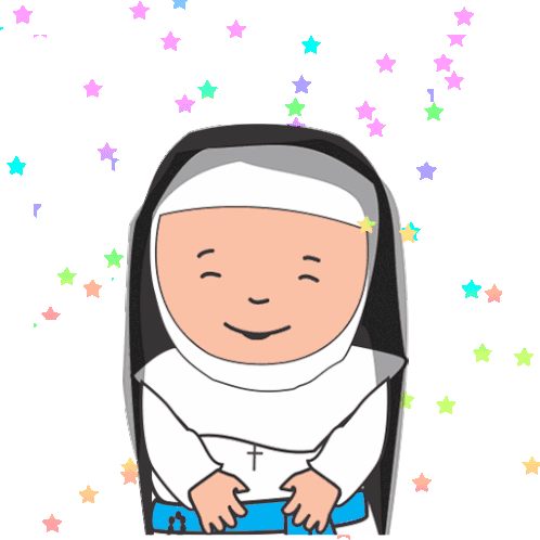 Delia Mic, a cheerful cartoon nun, celebrates with the number 120 and colorful stars sparkling around her.