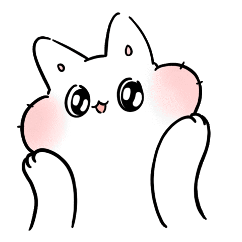 A cute, white, cartoon cat-like creature with big eyes and pink cheeks, expressing delight and joy with its paws near its face.