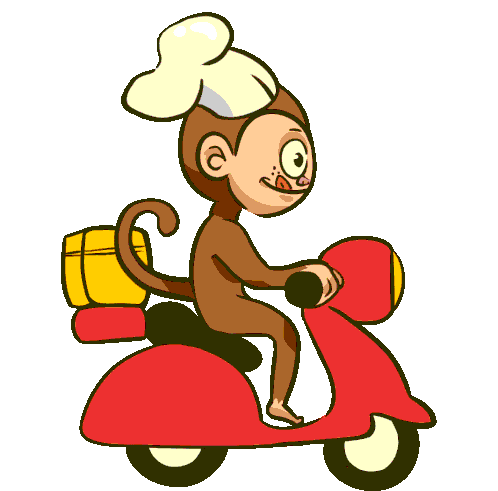 An animated cartoon monkey chef, Monomoro, rides a red scooter with a yellow delivery box, ready to deliver food.