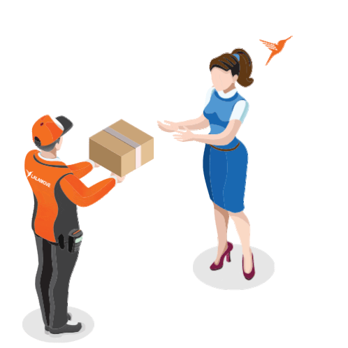 An isometric illustration of a Lalamove delivery driver handing a package to a customer, with a small bird flying nearby.