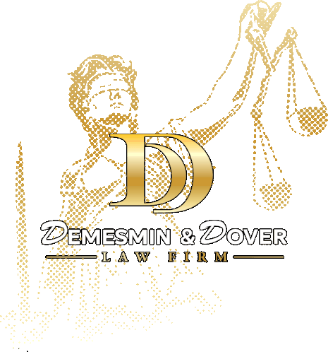 Demesmin And Dover Law Firm logo featuring Lady Justice, representing legal services and justice.