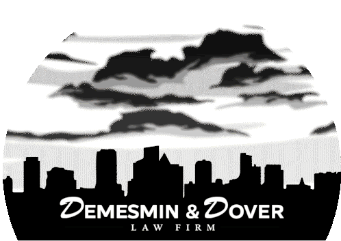 Animated sticker for Demesmin & Dover Law Firm, featuring their logo, city skyline, and phone number 866-954-MORE (6673).