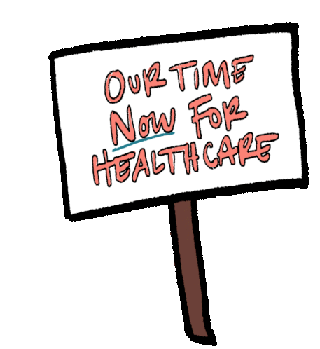 A protest sign advocating for better healthcare, displaying the message 'OUR TIME Now FOR HEALTHCARE' in a bold, hand-drawn style.