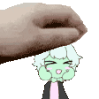 A playful animated sticker showing a hand gently placing a small, adorable green alien character with large eyes onto a person's head.