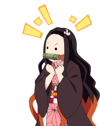 Nezuko Kamado from Demon Slayer looks surprised and excited, with yellow exclamation marks around her head, clenching her fists.