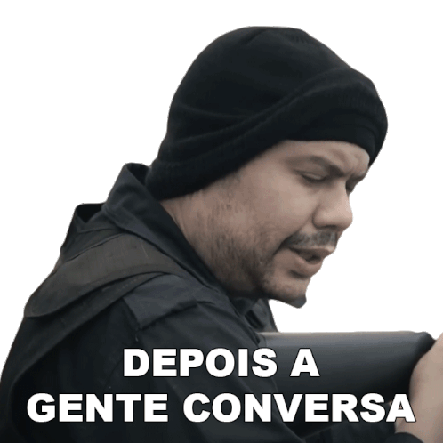 Pedro Benavides, from Porta Dos Fundos, says 'Depois A Gente Conversa' (We'll Talk Later), signaling a postponement or a need for a private discussion.