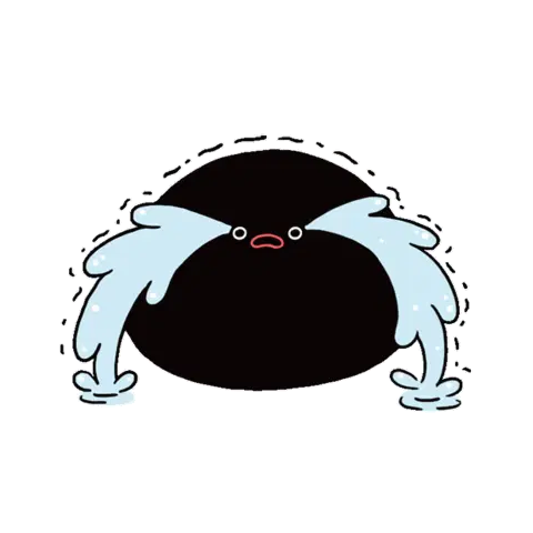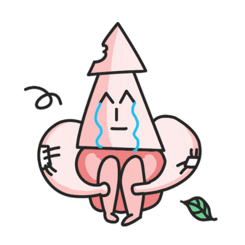 A sad, pink, triangular character with muscular arms and legs sits hunched over, crying blue tears.