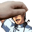 Derek Stiles from Trauma Center, wearing headphones and a hat, gently holds a pet dog's head in this animated sticker.
