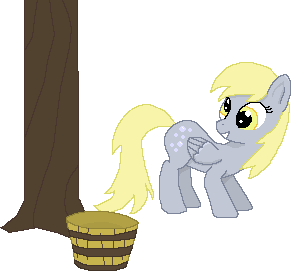 Derpy Mlp joyfully watches muffins fall from a magical Muffin Tree into a barrel, ready for a delicious harvest.
