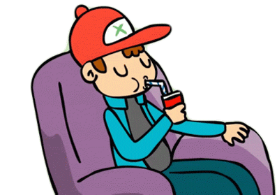 A relaxed cartoon boy in a red cap and blue jacket sits on a purple armchair, enjoying a refreshing soda with a straw.