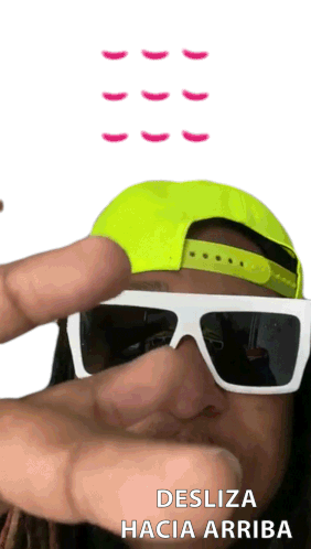 Man with dreadlocks, white sunglasses, and a neon green cap gestures to swipe up. Energetic call to action.
