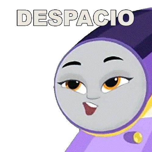 Kana the purple train from Thomas & Friends smiles and winks, with the word 'DESPACIO' (slowly) displayed above her.