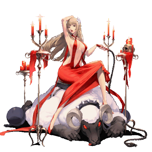 Destiny Child's Catherine/Katherine in a striking red dress, sitting atop a sheep and holding a whip, an alluring animation.