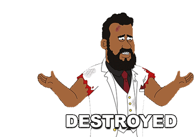 Gerald Fitzgerald from Paradise PD, looking utterly destroyed with torn clothes and a shrug, perfectly conveys a state of ruin.