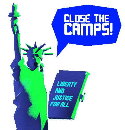 Animated Statue of Liberty advocating for human rights, holding a tablet with 'Liberty and Justice for All' and a speech bubble saying 'Close the Camps!'.