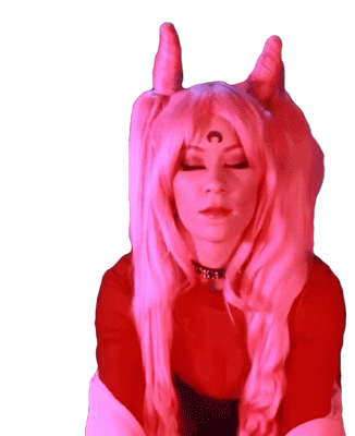 Kay Lynn Syrin in her Devil Costume cosplay, featuring a pink wig with horns and a crescent moon symbol.