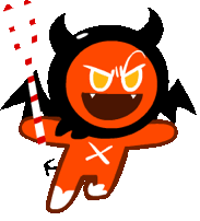 Devil Cookie, the mischievous gingerbread character, dances energetically in a pixel art animation, holding a candy cane.