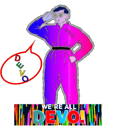 Mark Mothersbaugh of Devo salutes in a vibrant rainbow jumpsuit with 'We're All Devo!' text.